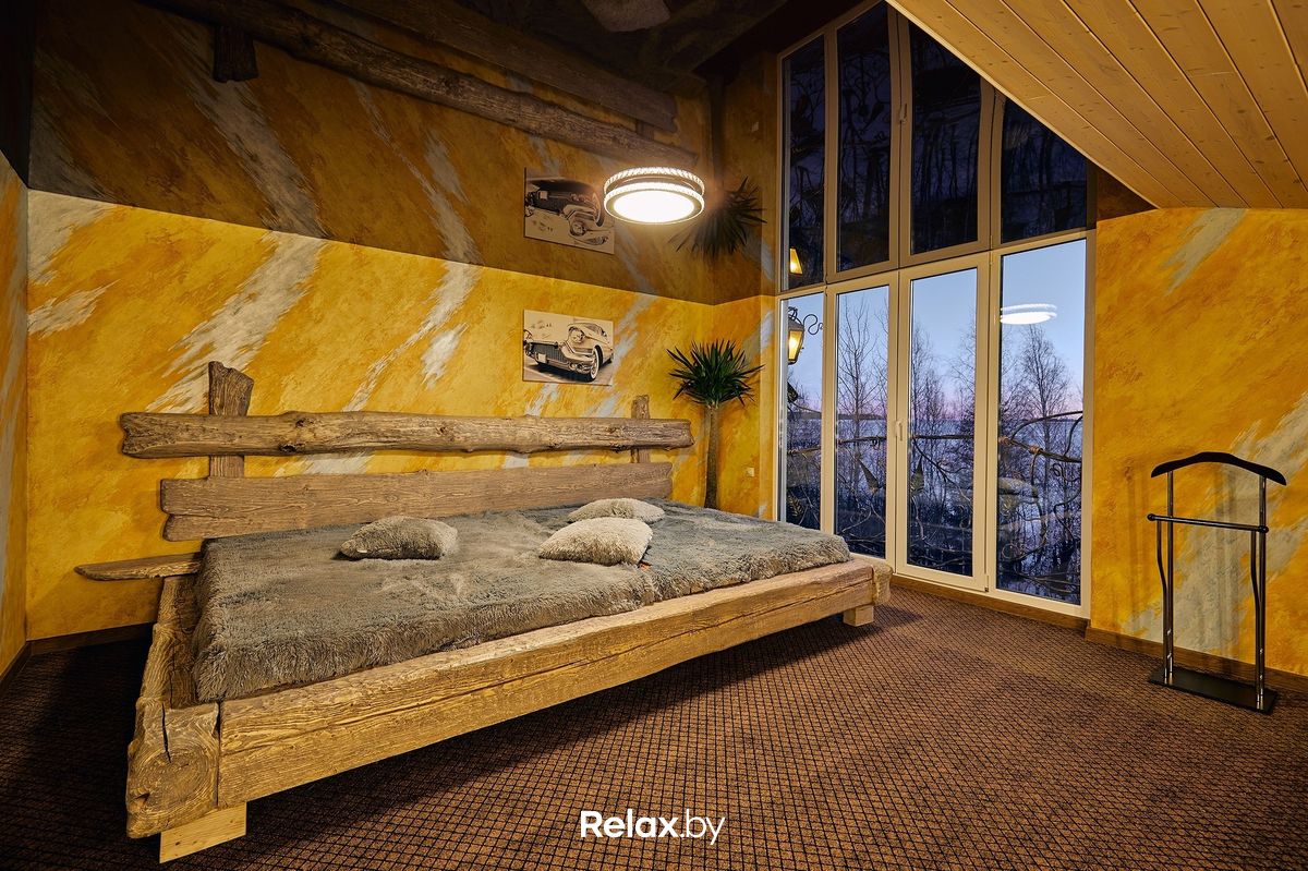 Внутри дома есть 5 комнаты отдыха с двуспальными кроватями и мебелью, чтобы комфортно разместиться на несколько дней. Только современная сантехника и бытовая техника кухни: все блага цивилизации доступны даже в загородной поездке. Из дома оборудован выход на террасу, которая легко превращается в дополнительное место для праздника. Тут можно оборудовать настоящий банкетный зал на свежем воздухе. Для мероприятий внутри дома предлагается 2 банкетных зала (20-50 чел.) с уникальными интерьерами.