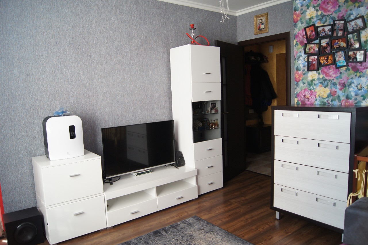 Однокомнатная квартира на пятом этаже 9-этажного кирпичного дома 1993 года постройки в северо-восточной части города. Общая площадь 35,2 кв.м. Сделан хороший ремонт: потолки оштукатурены и окрашены краской, напольные покрытия положены на бетонную стяжку. В просторной жилой комнате 18,9 кв.м. ниша отделена перегородкой, что позволяет ее использовать в качестве детской. Стены комнаты и ниши оклеены обоями современного дизайна, полы – ламинат. Совмещенный санузел облицован керамической плиткой новой коллекции, заменены сантехнические трубы, сантехника, полотенцесушитель. Функционально организовано вместительное пространство кухни: мебельный гарнитур лаконичного дизайна со встраиваемой техникой: варочная панель, вытяжка, мойка. Отделка стен кухни и прихожей выполнена с использованием декоративной штукатурки, полы – новый линолеум (кухня) и плитка. Встроенный шкаф-купе в прихожей – объемная и удобная система хранения. Лоджия застеклена стеклопакетами и утеплена, полы – ламинат. Входная дверь – металлическая, межкомнатные – из экошпона. Телефон, домофон, высокоскоростной интернет (оптоволокно).