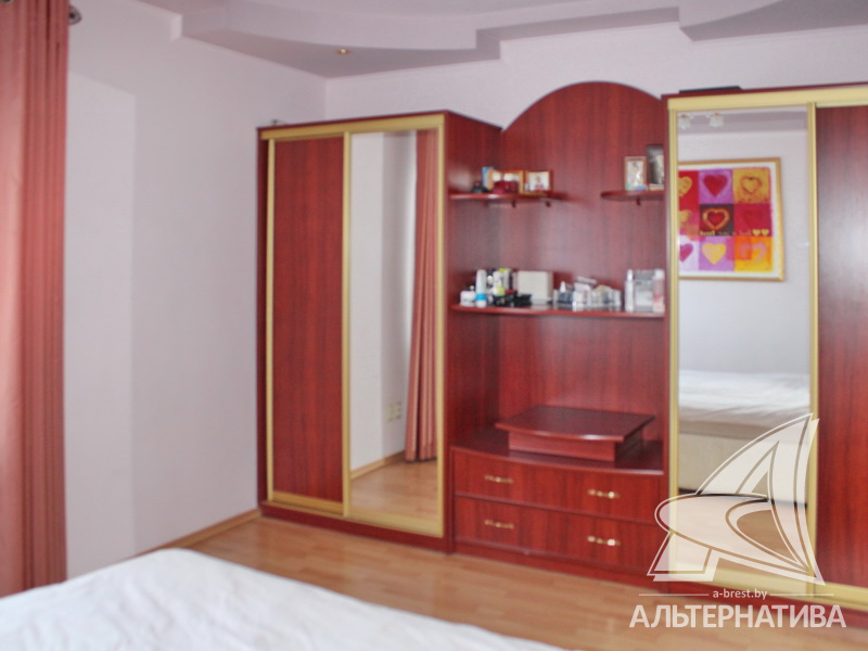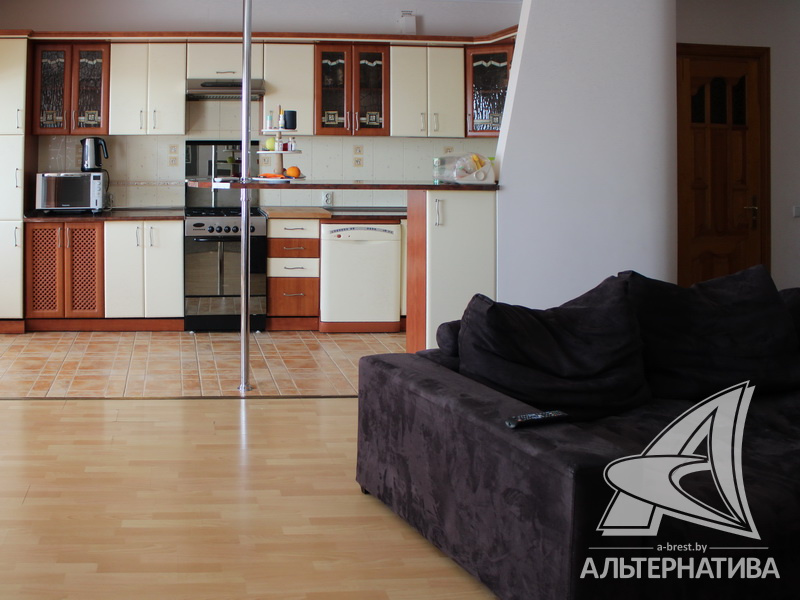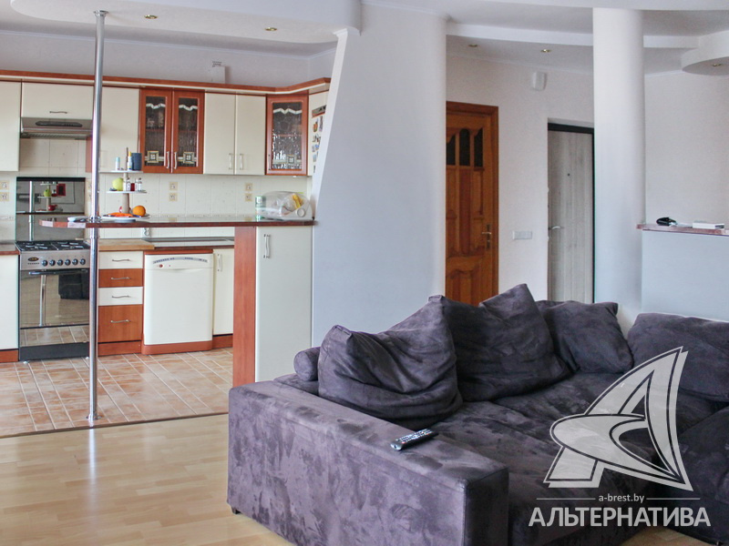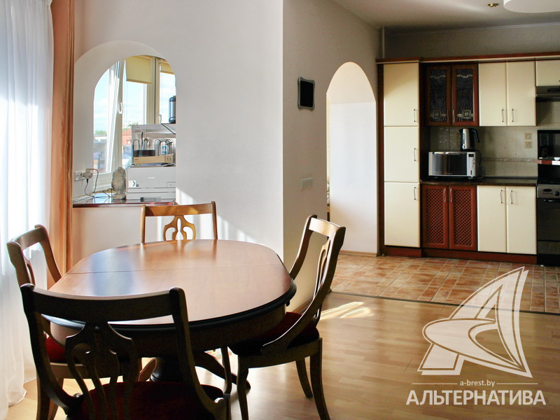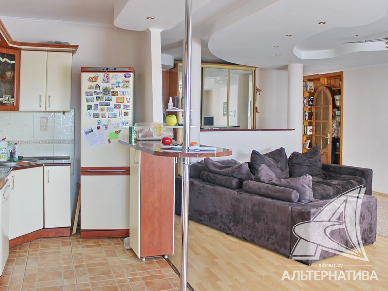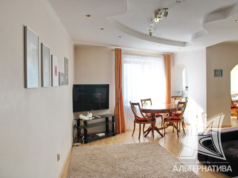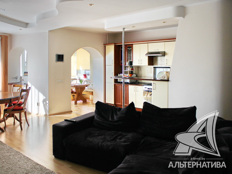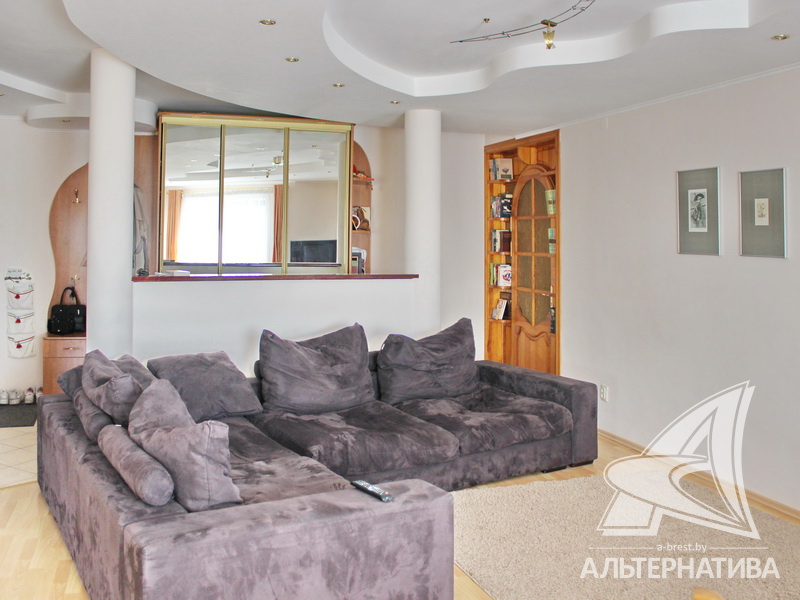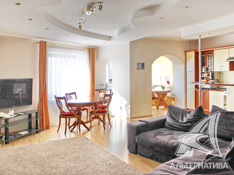 4-комнатная квартира, г. Брест, ул. Энгельса, 2001 г.п., 5 / 7 кирпич, 132,6 / 132,6 / 88,3 / 16,3, два санузла, стеклопакеты, межкомнатные двери - массив, входная дверь металлическая, многоуровневые потолки с интересной системой освещения, полы - ламинат и плитка, стены оклеены обоями, в санузле современная плитка, заменен полотенцесушитель, акриловая ванна, телефон, домофон. Встроенный кухонный гарнитур, барная стойка, бытовая техника. Шкафы-купе. Гардеробная, постирочная. Квартира с индивидуальными дизайнерскими решениями. Квартира расположена на две стороны. Окна жилых комнат выходят во двор на зеленую зону. Во дворе парковка для автомобилей. Есть своя закрытая территория. Благоустроенный двор. Рядом парк, бассейн, спортивный комплекс, поликлиника, школа, детский сад.