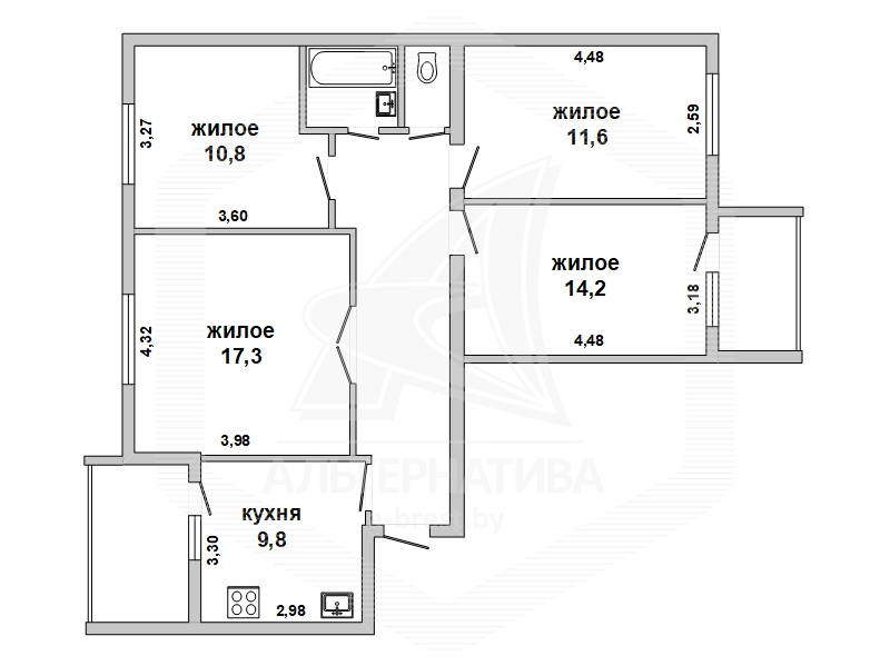 4-комнатная квартира, г. Брест, ул. Красногвардейская, 1998 г.п., 5 / 5 кирпич, 86,1 / 80,8 / 53,9 / 9,8, санузел раздельный, две лоджии застеклены, подвал, деревянные окна, межкомнатные двери - массив, входная дверь металлическая, потолки 2,5 м - снежка (гостиная и две спальни), натяжной (одна комната) и оклеены касетонами (коридор и кухня), полы - доска под лак, стены оклеены обоями, чугунная ванна, телефон, домофон. Квартира в жилом состоянии. Квартира расположена на две стороны. Окна выходят на зеленую зону. Чистый подъезд. Во дворе игровая детская площадка, парковка для автомобилей. Есть технический этаж, двускатная крыша.