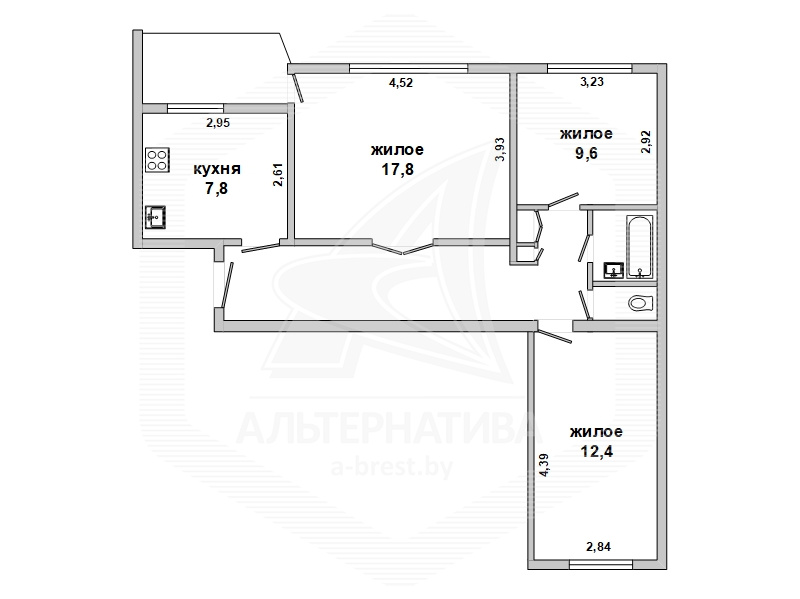 3-комнатная квартира, г. Брест, ул. Московская, 1975 г.п., 3 / 9 кирпич, 67,9 / 65,6 / 39,8 / 7,8, санузел раздельный, подвал, лоджия застеклена, деревянные окна, деревянные межкомнатные двери, входная дверь деревянная, потолки - побелка (2,50 м), полы - ДСП, стены оклеены обоями, телефон, домофон. Кухонный гарнитур. Квартира в жилом состоянии. Квартира расположена на две стороны. Один пассажирский лифт.