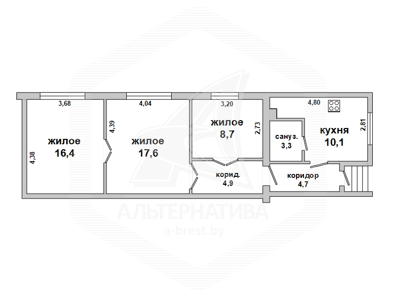 Квартира в блокированном жилом доме в г.Бресте. 1989 г.п. 1 этаж. Общ.СНБ - 65,7 кв.м, общ.- 65,7 кв.м, жил.- 42,7 кв.м, кух.- 9,0 кв.м. 3 комнаты.