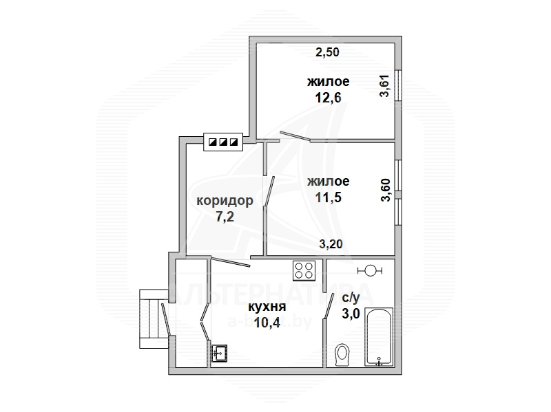 Квартира в блокированном жилом доме в г.Бресте. 1960 г.п. 1 этаж. Общ.СНБ - 44,9 кв.м, общ.- 44,9 кв.м, жил.- 24,1 кв.м, кух.- 10,4 кв.м. 2 комнаты.