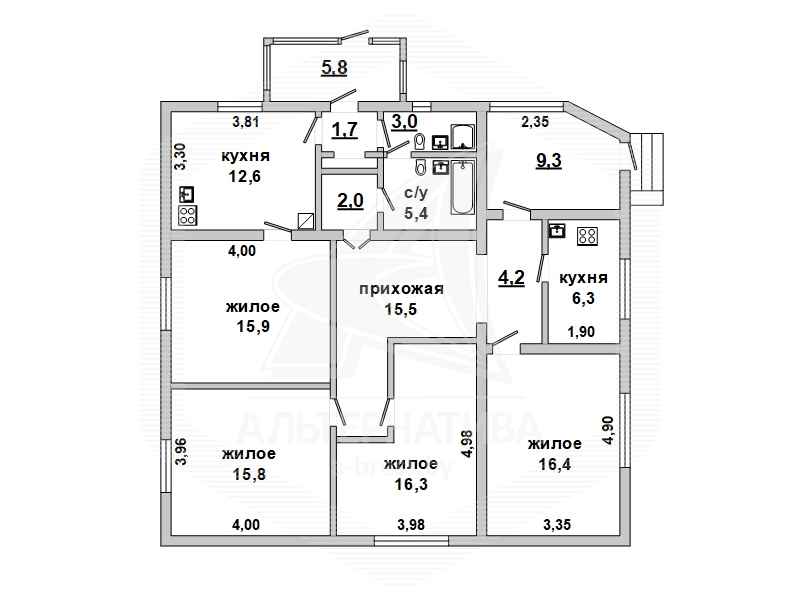 Жилой дом в г.Бресте. 1932 г.п., реконструкция 1989 г.п. 1 этаж. Общ.СНБ - 130,7 кв.м, общ.- 115,6 кв.м, жил.- 64,4 кв.м, кух.- 12,6 кв.м. + 6,3 кв.м. 4 комнаты, потолки - 2,9 м.