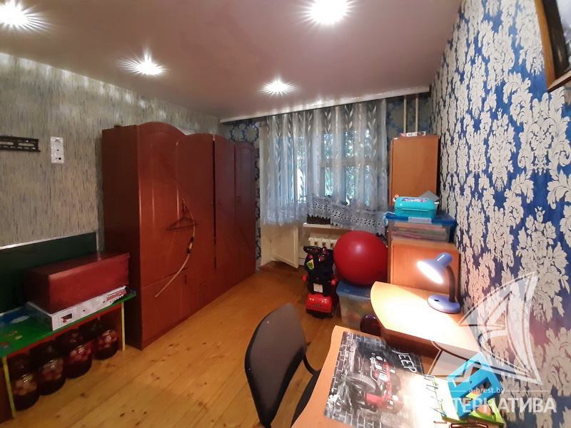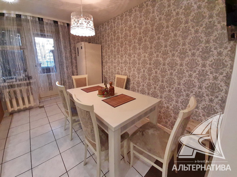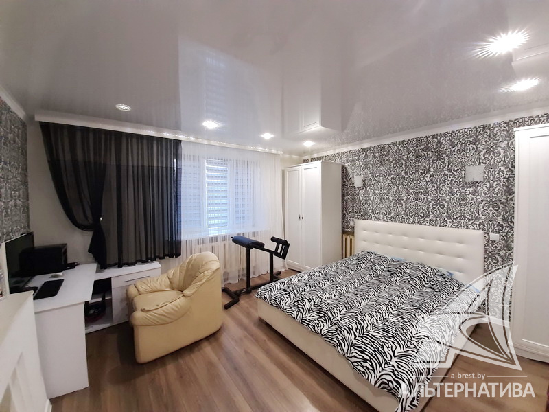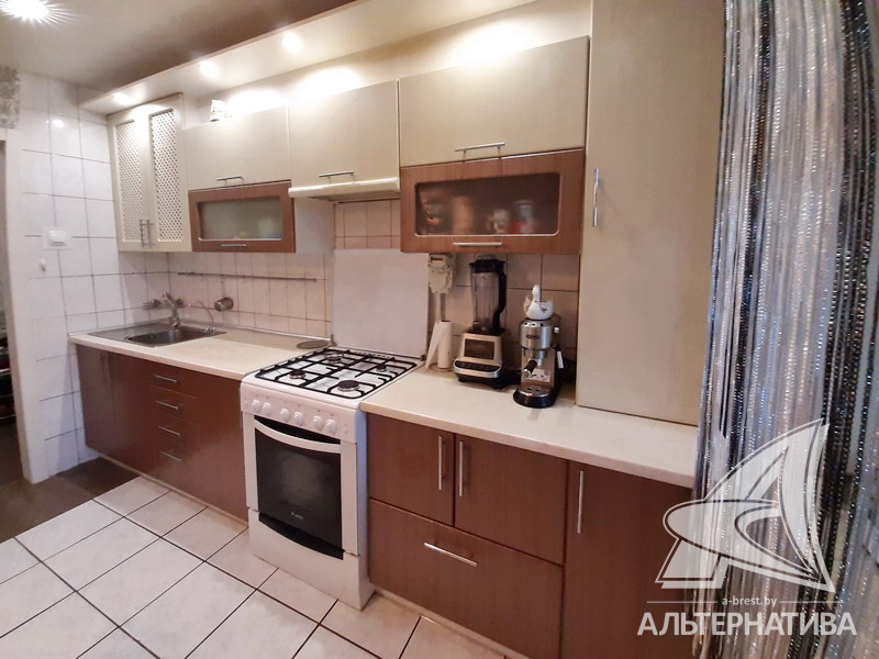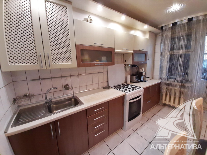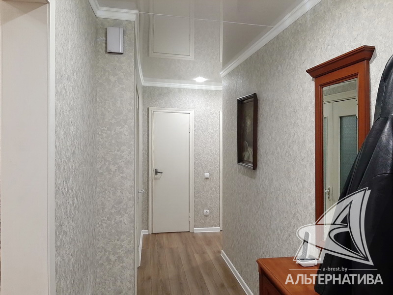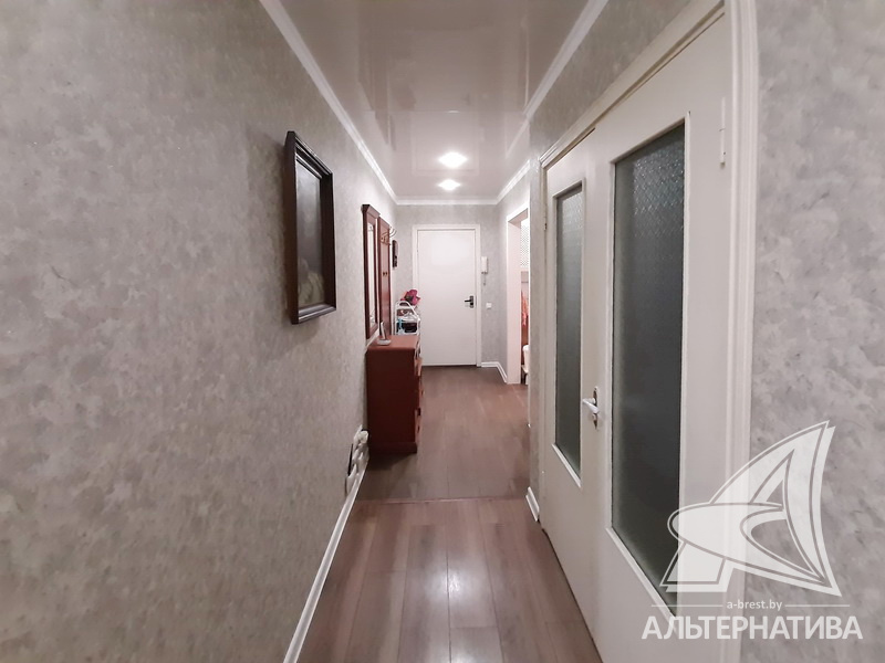 3-комнатная квартира, г. Брест, ул. Стафеева, 1997 г.п., 1 / 5 кирпич, 70,4 / 60,5 / 41,6 / 10,0, санузел раздельный, подвал, две лоджии застеклены, деревянные окна, в зале стеклопакеты, деревянные межкомнатные двери, натяжные потолки, полы - доска под лак, ламинат, плитка (прихожая, кухня) (положены на стяжку - кухня и зал), стены оклеены обоями, в санузле современная плитка, заменена сантехника, душевая кабина, заменены сантехнические трубы (пластик), инсталляция, проведена новая электропроводка, новый электросчетчик, телефон, домофон. Кухонный гарнитур, шкаф-купе в спальне. В квартире частично произведен ремонт. Окна жилых комнат выходят во двор. Во дворе парковка для автомобилей. Дом расположен в глубине двора.