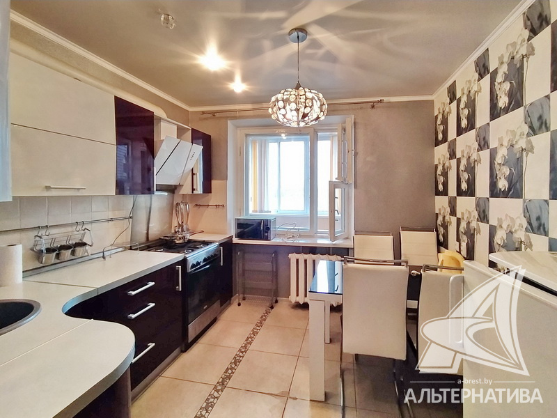 3-комнатная квартира, г. Брест, ул. Кооперативная, 1978 г.п., 7 / 7 кирпич, 70,9 / 66,8 / 39,9 / 8,6, санузел раздельный, подвал, лоджия застеклена (стеклопакеты), межкомнатные двери – МДФ, входная дверь металлическая, потолки - снежка, полы - паркет и плитка (кухня), стены оклеены обоями, в санузле современная плитка, заменена сантехника, заменен полотенцесушитель, акриловая ванна, телефон, домофон. Кухонный гарнитур, газовая плита, вытяжка, обеденная группа, стиральная машина. Кровать, набор мебели в гостиной. Остальная мебель по договоренности. Квартира с хорошим ремонтом. Квартира расположена на две стороны. Чистый подъезд. Один новый пассажирский лифт. На площадке имеется закрытое место для колясок и велосипедов. Во дворе парковка для автомобилей. Технический этаж.