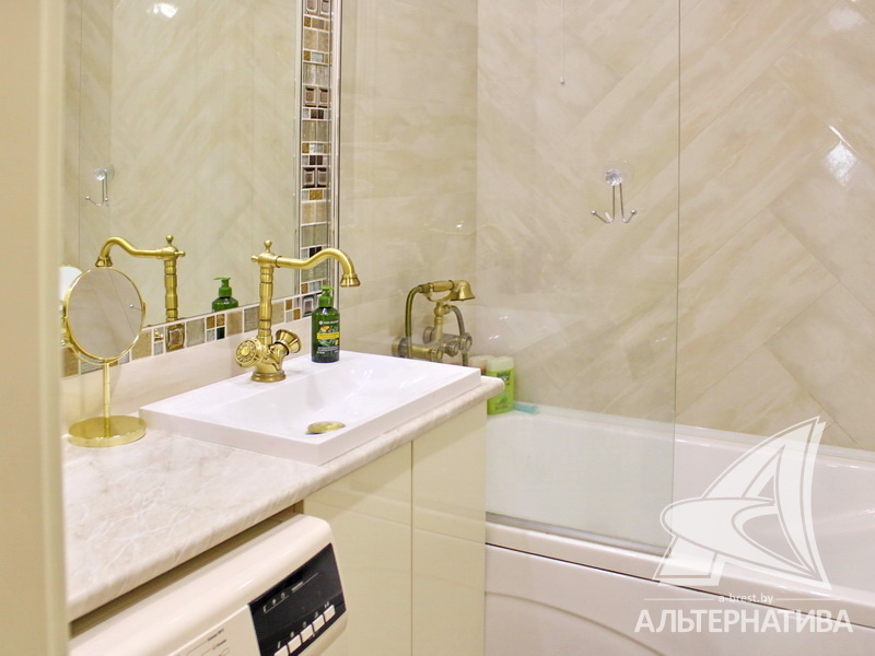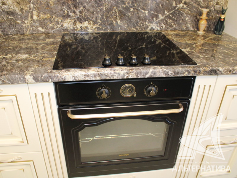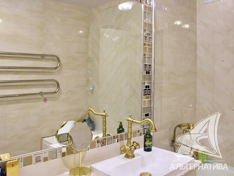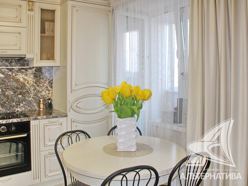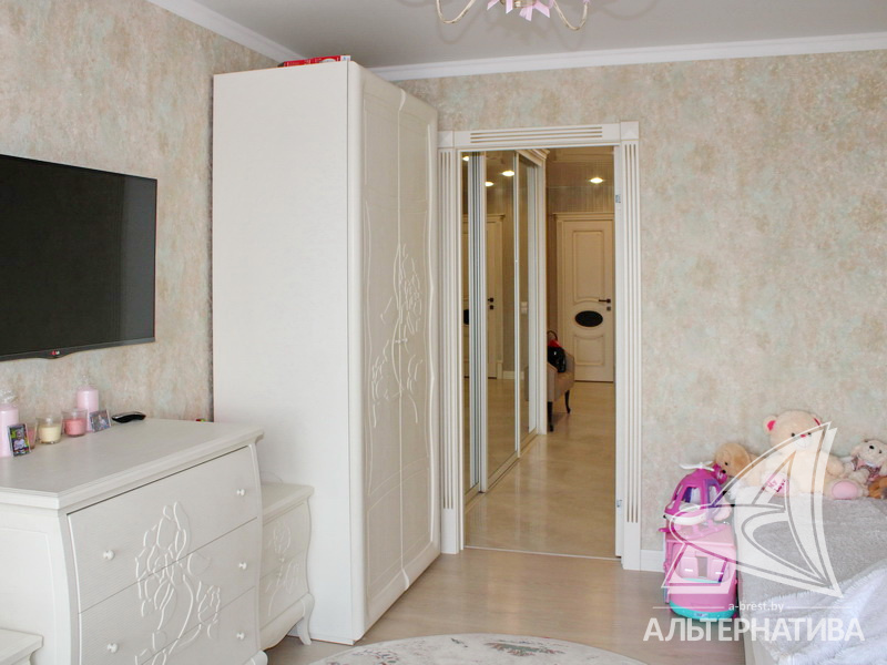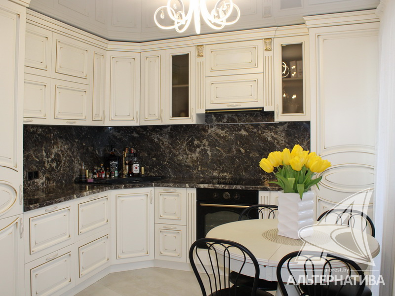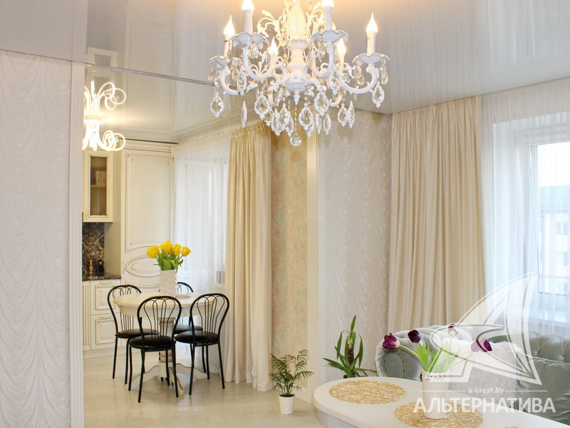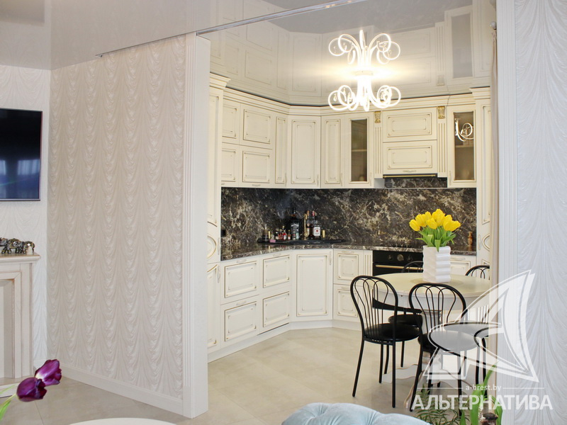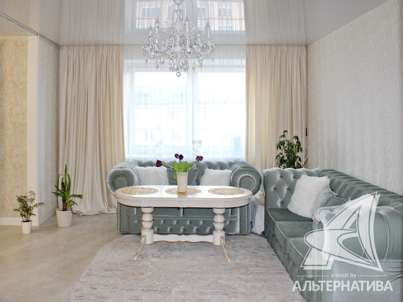 3-комнатная квартира, г. Брест, ул. Мошенского, 2017 г.п., 5 / 5 кирпич, 74,5 / 72,6 / 43,3 / 9,5, санузел раздельный, лоджия застеклена, стеклопакеты, межкомнатные двери – шпон, входная дверь металлическая, натяжные потолки (глянец) (2,60 м), полы - ламинат и плитка Польша ( "Парадиз" ), стены оклеены обоями (Италия), инсталляция, автономный газовый котел, система индивидуального отопления, телефон, домофон. Вся мебель и бытовая техника. Кухонный гарнитур и обеденная группа, фурнитура Blum. Индукционная варочная панель, духовой шкаф, вытяжка Gorenje, посудомоечная машина Bosch, стиральная машина. Столы и комод (в кухне и гостиной - шпон из дуба). Электрокамин. Диваны в гостиной, кровать в спальне и пуфы - изготовлены по индивидуальному дизайнерскому заказу. Два телевизора, два шкафа-купе. Все люстры и светильники. Квартира с индивидуальными дизайнерскими решениями. Чистый подъезд. Во дворе парковка для автомобилей. Технический этаж (3,30 м) - есть возможность сделать второй уровень. Дом расположен в глубине двора. Есть своя закрытая территория. Рядом магазины, детский сад, школа, остановка общественного транспорта.