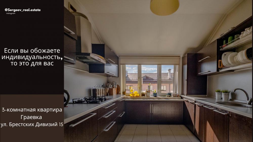 О квартире: 3-комнатная квартира на 5-ом этаже 5-этажного кирпичного дома 2008 года постройки. Площадь квартиры – 100,2 м² с двумя лоджиями. Высота помещений - 2,7 м. зал - 22,9 м² с выходом на лоджию - 3,4 м²; кухня - 16,2 м²; спальня №1 - 18,6 м² с выходом на лоджию - 3,4 м²; спальня №2 - 12,8 м²; ванная комната - 8,8 м²; коридор - 14,1 м². г. Брест, Граевка, ул. Брестских Дивизий 15. Преимущества квартиры: окна выходят на три стороны света - запад, север, восток; до “Северного сквера” 3 минуты пешком, отличные прогулки по вечерам. Недостатки квартиры каждый найдет для себя сам. Экспертная оценка "Риабай". Индекс Place Quality Investment. Место – 7,5. Качество жилья – 7,8. Инвестиционная привлекательность – 8,8. Обременений по квартире нет. Чистая продажа. Бесплатно проконсультируем по всем квартирам г. Бреста. Поможем сделать правильный выбор и не совершить ошибку. Ваша квартира в зачет. Приглашаем к сотрудничеству агентов и риэлтеров. Конкурсная продажа - предложите свои условия покупки. Звоните и записывайтесь на просмотр.