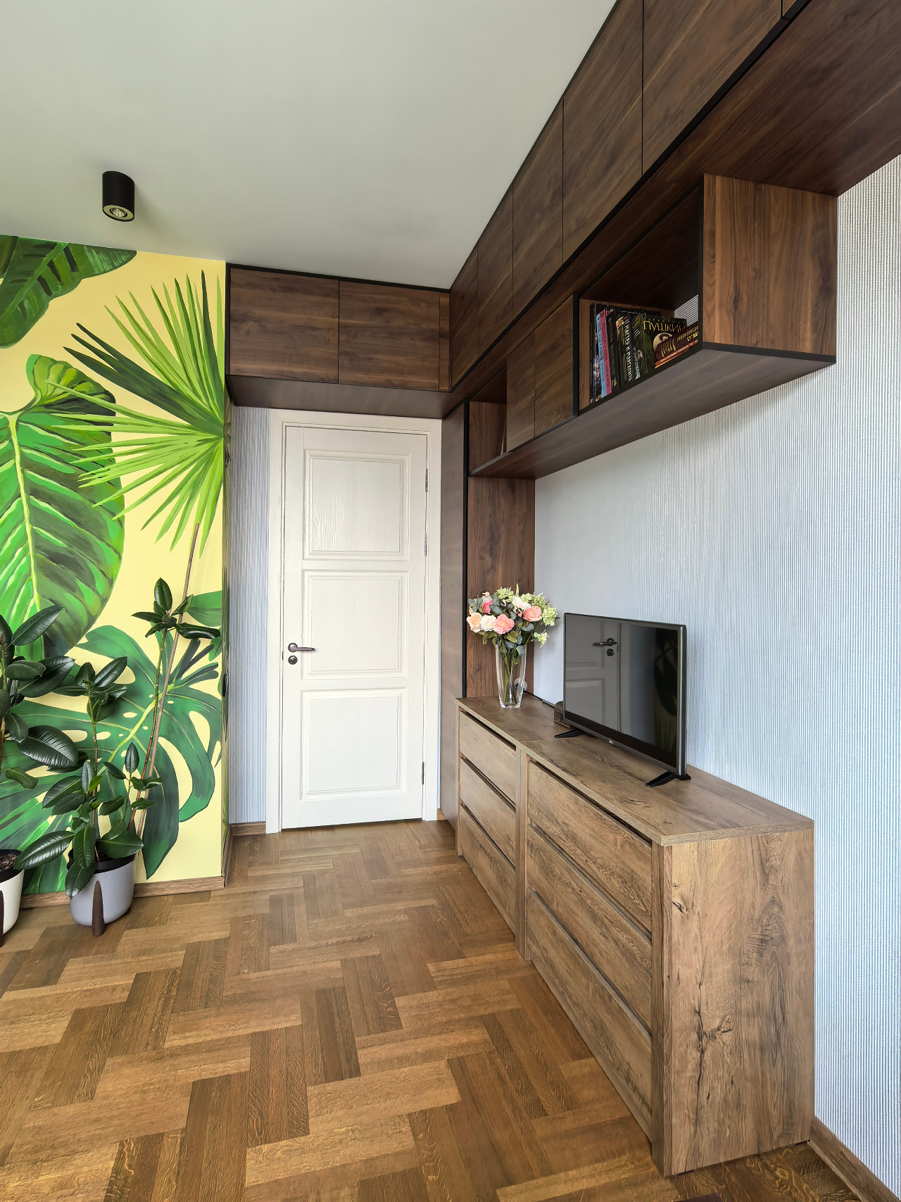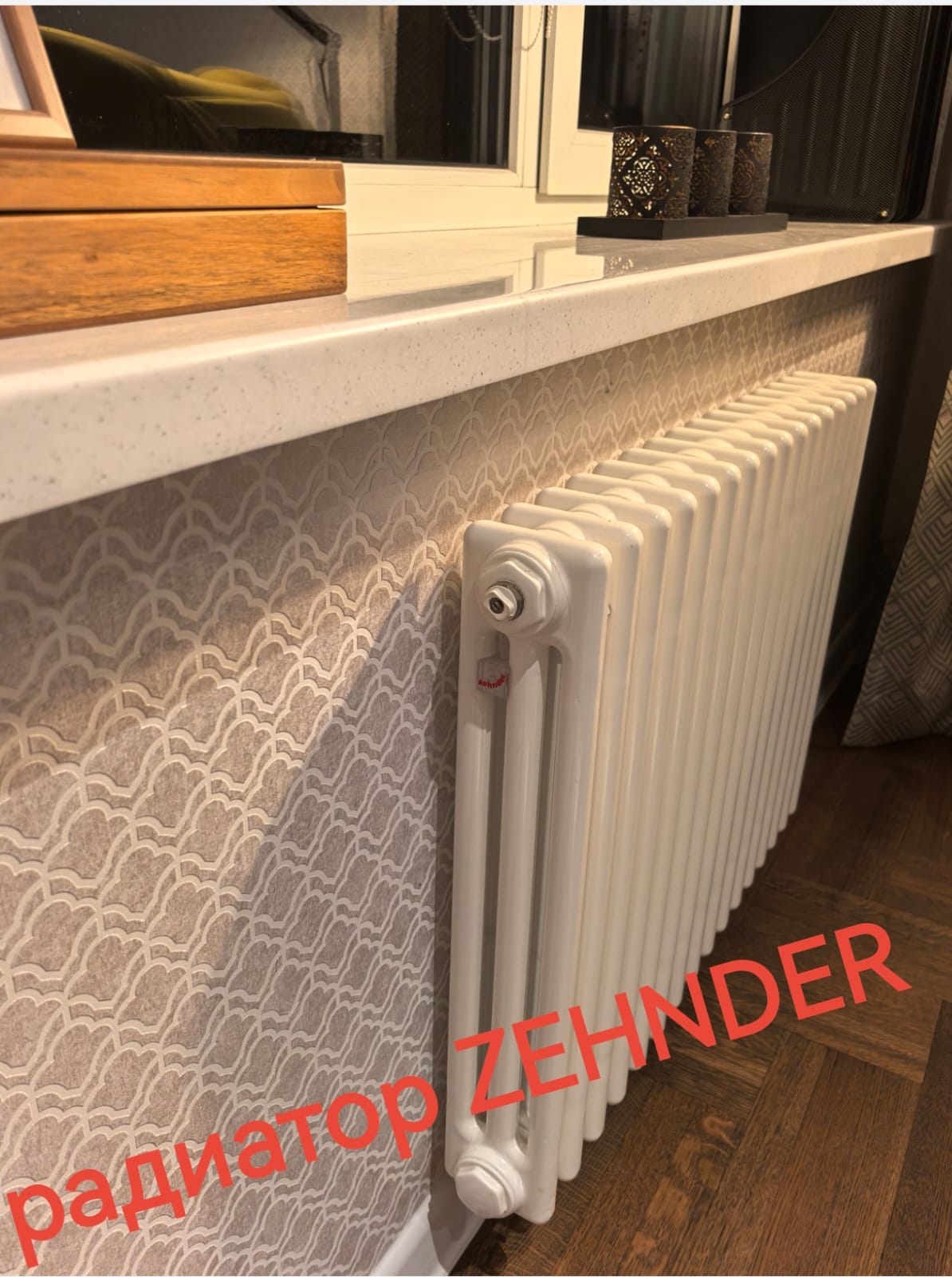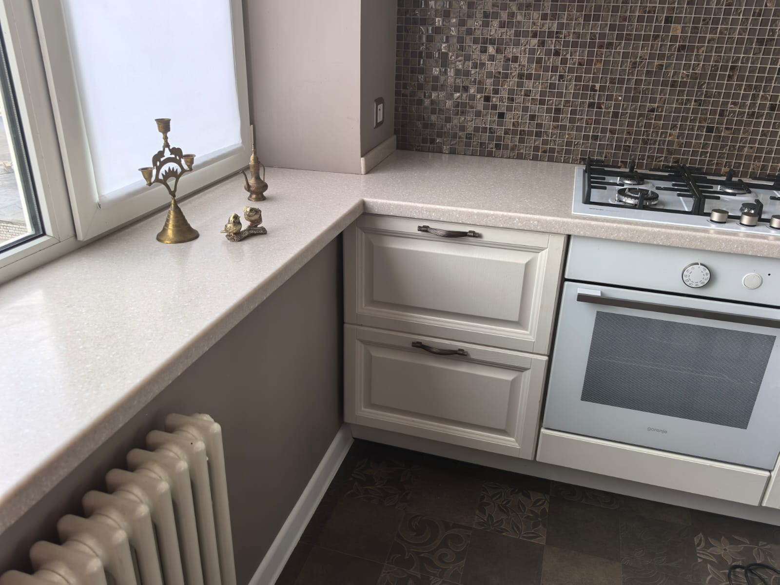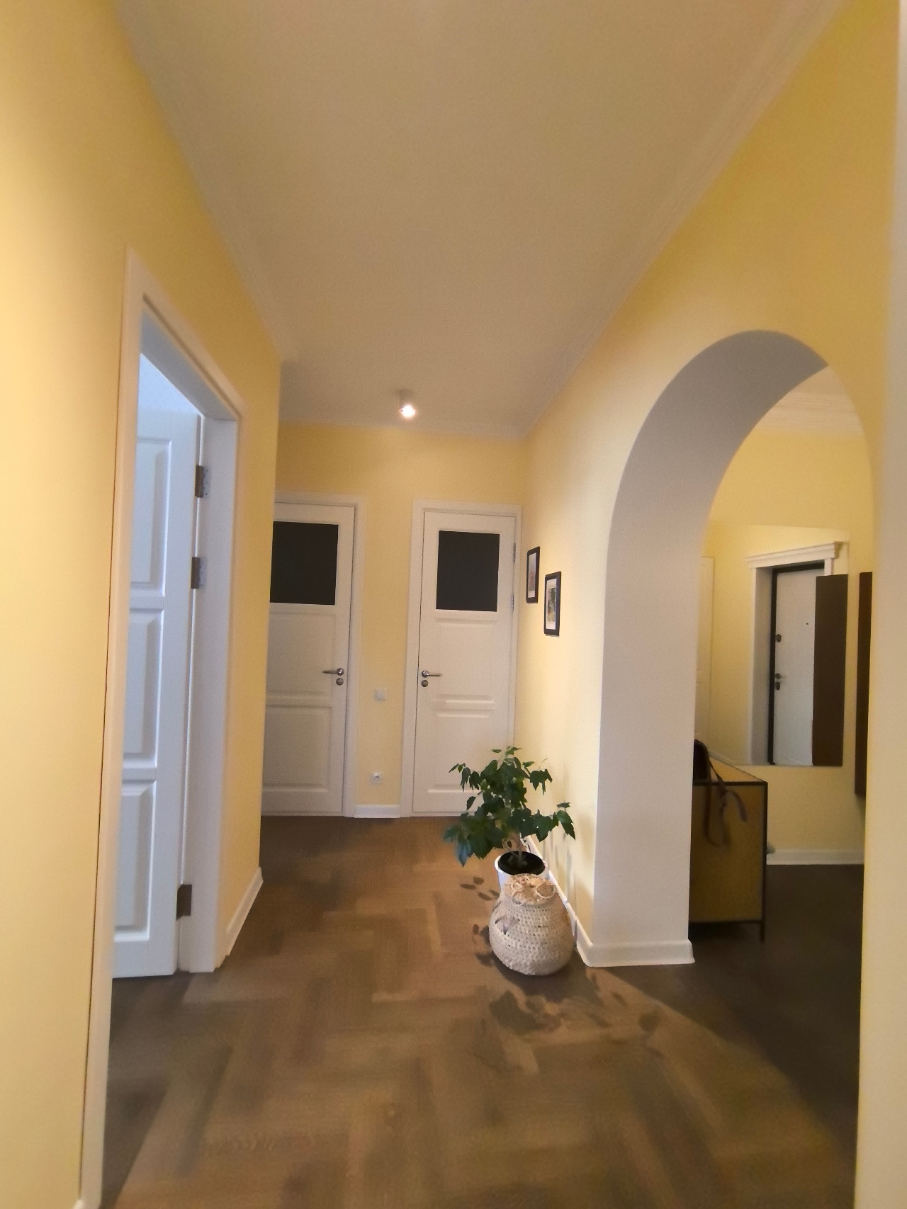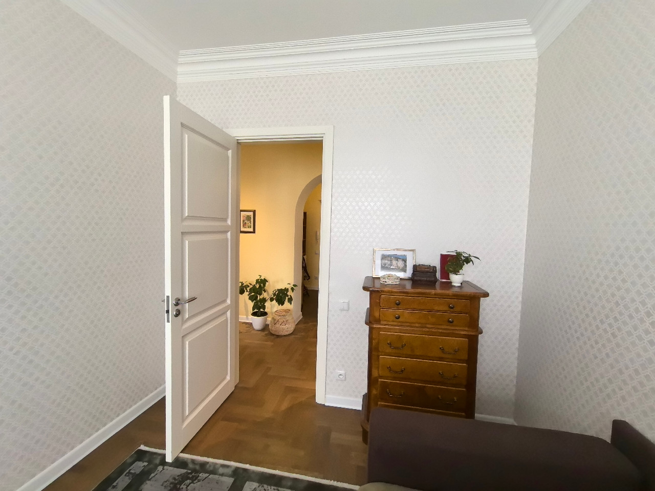 Белые двери из массива высотой 2,3м. Дубовый паркет обработан маслом. Все подоконники и столешница в кухне и ванной - из искусственного камня.