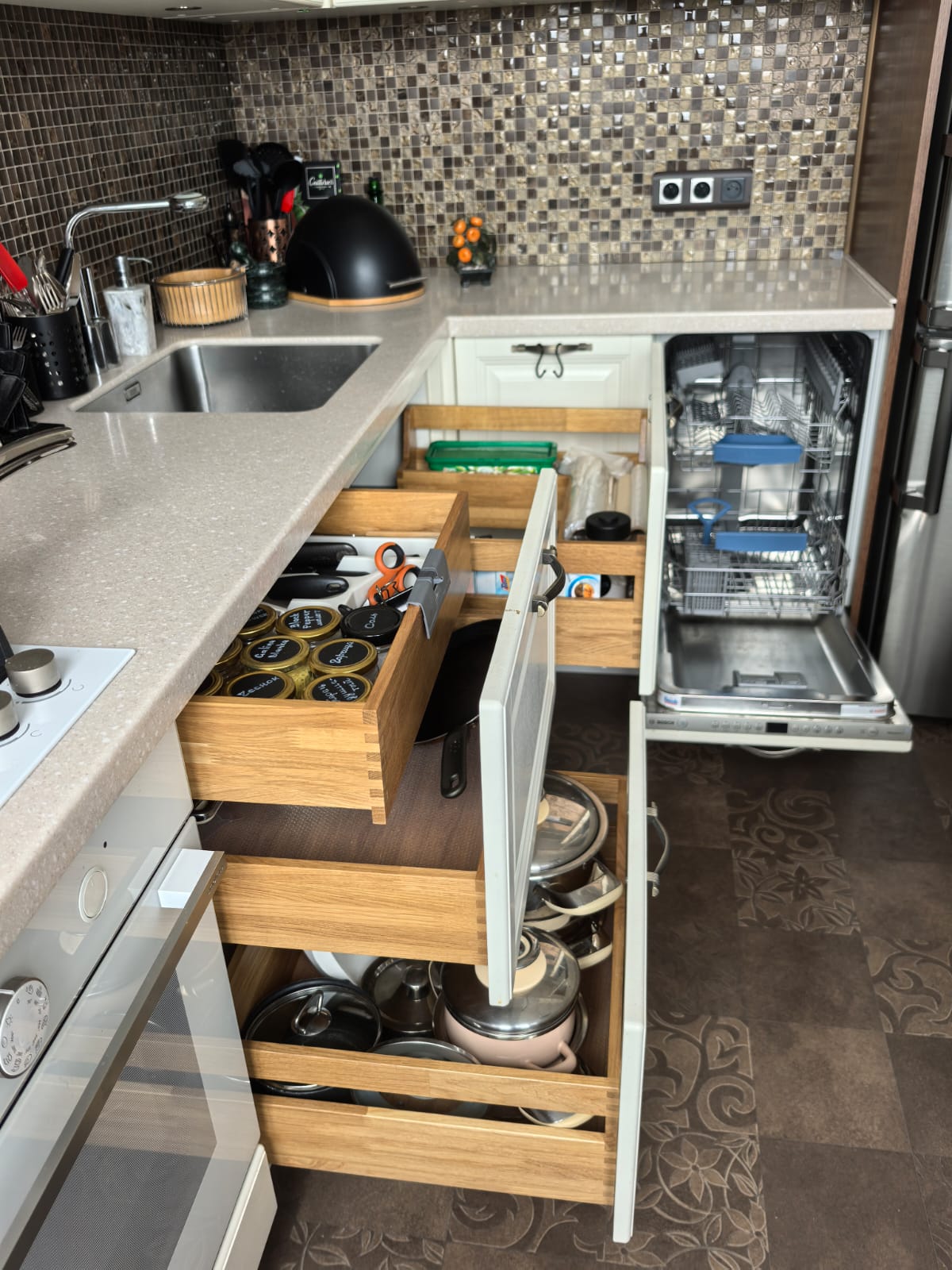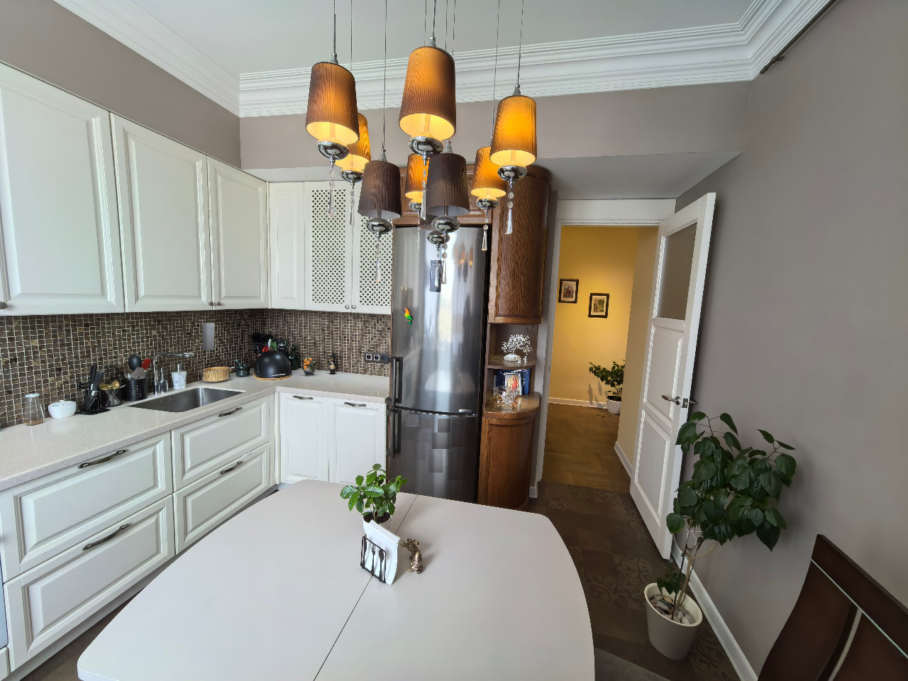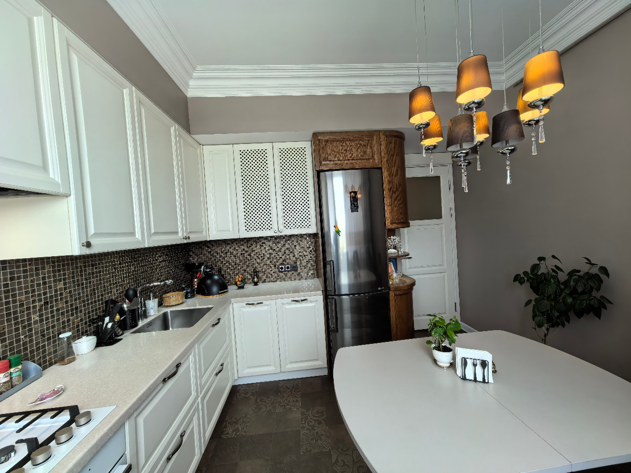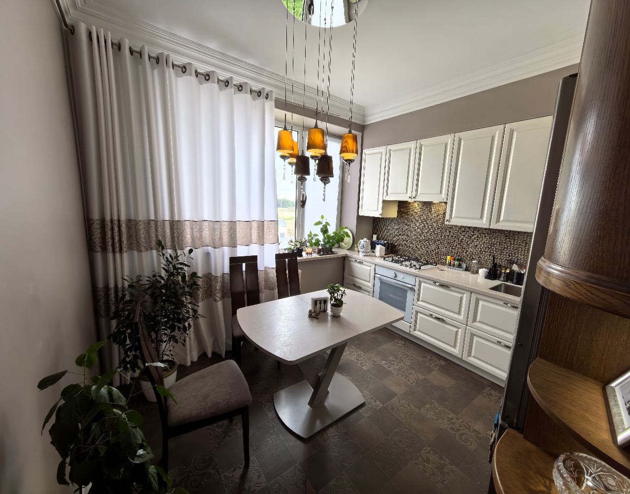 Кухня Yavid с дубовыми фасадами укомплектована варочной панелью и электродуховкой Gorenje + холодильник LG + посудомоечная машина Bosch. Высота верхнего ряда подвесных шкафов 96см. Вытяжка 80см итальянской фирмы Elica. Подвесная мойка Franke 40х48см. Кухонный стол, стулья из массива и люстра Chiaro также достанутся новым владельцам.