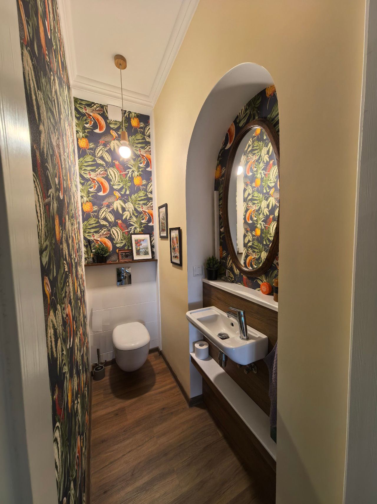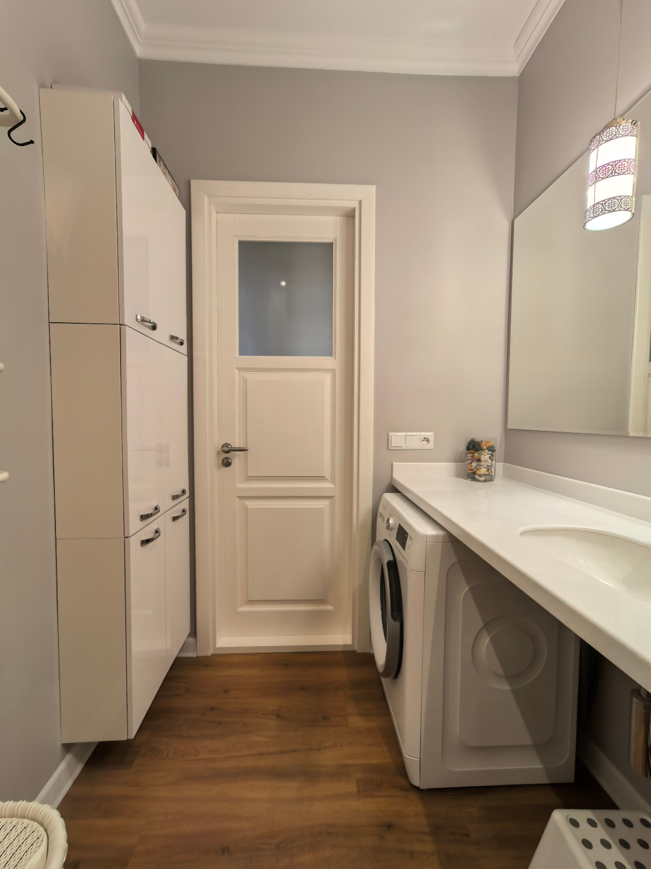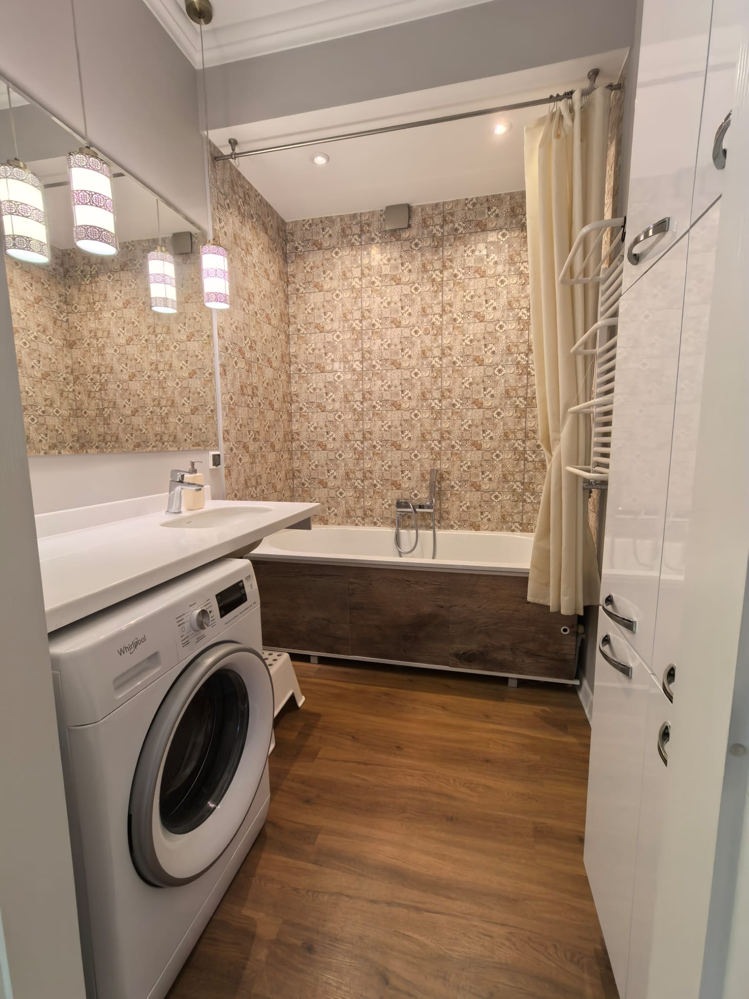 Просторная ванная вмещает полноразмерную стиральную машину Whirlpool с функцией обработки паром, квариловую ванну Oberon 180х80 фирмы Villeroy & Boch, а также подвесные шкафчики, куда поместится всё необходимое.