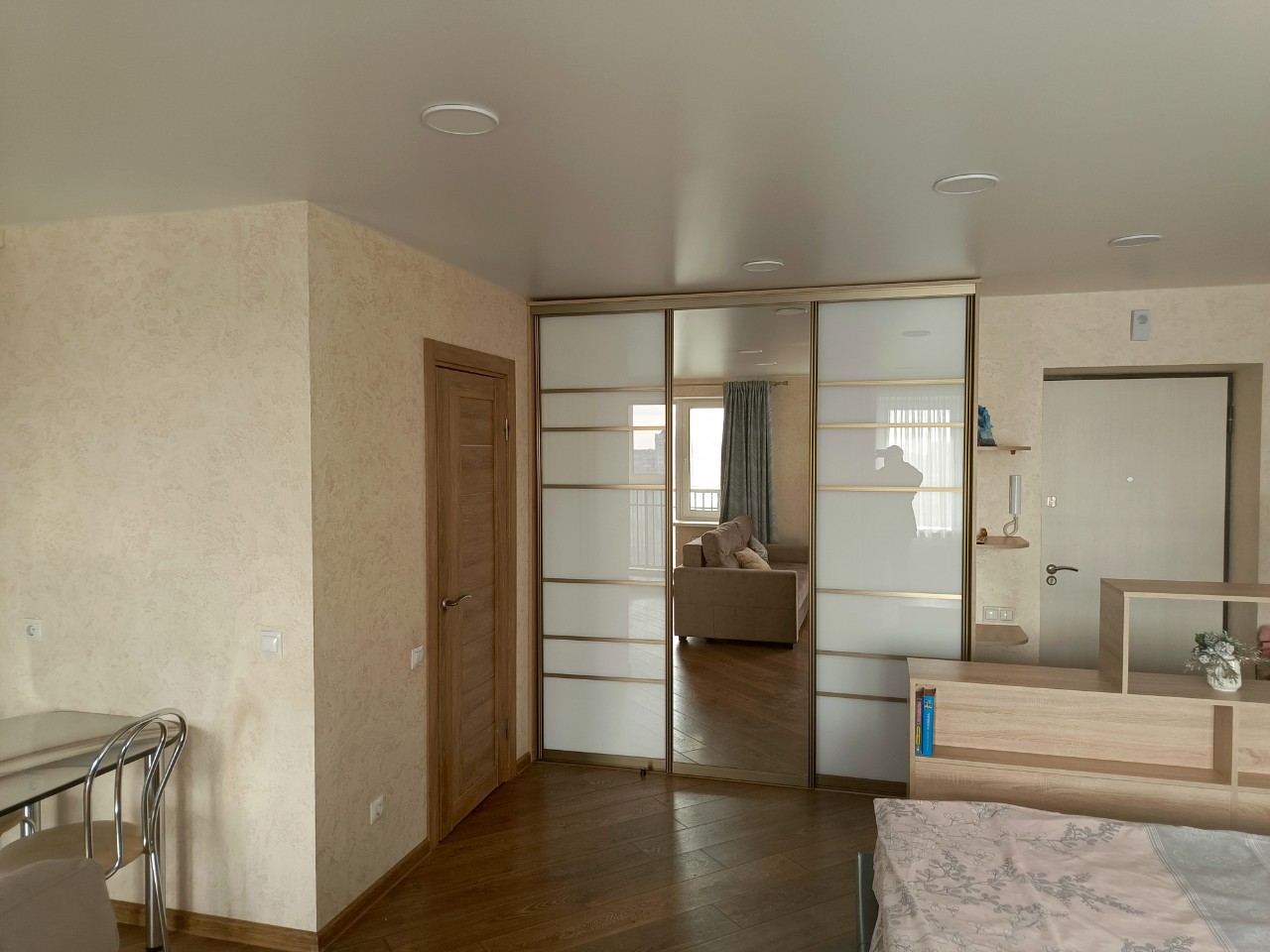 Квартира в отличном жилом состоянии: полы - ламинат и плитка, потолок - натяжной, на стенах декоративная штукатурка. Самое главное, что в квартире идеальная тишина, окна выходят на детскую больницу, во всех соседских квартирах закончились ремонты и вас не потревожит звук перфоратора.